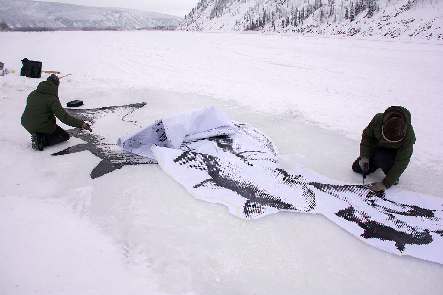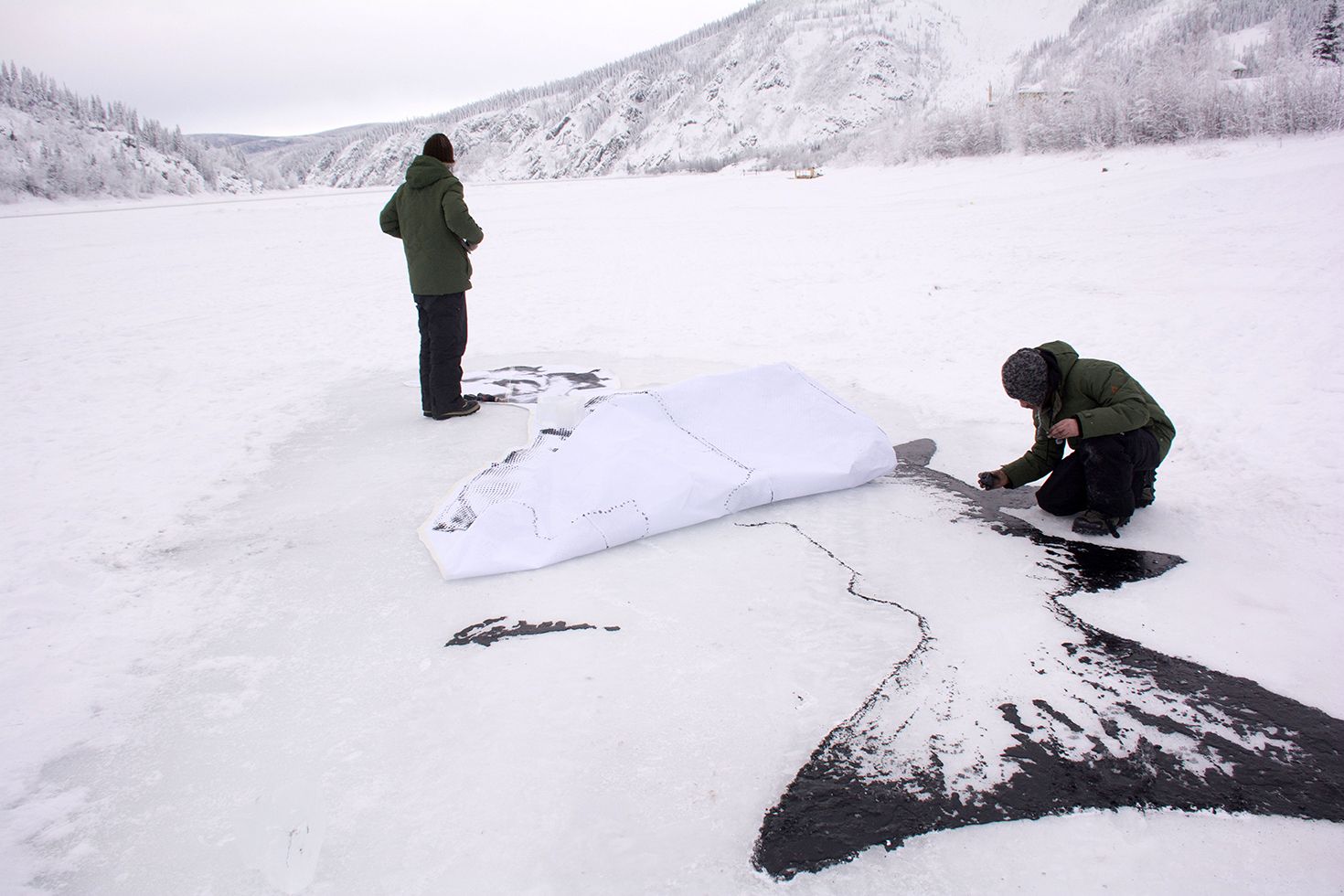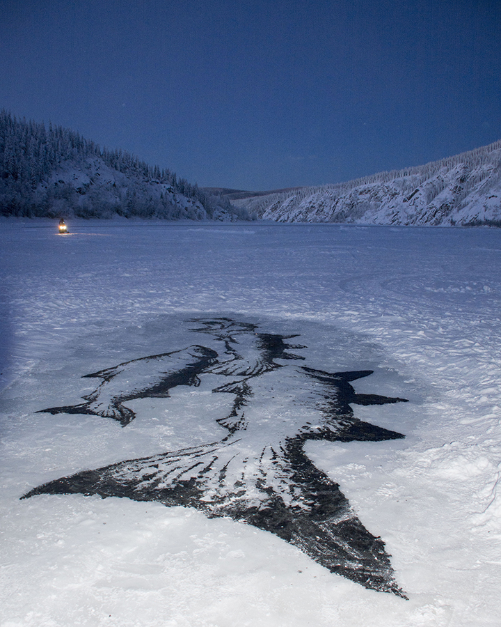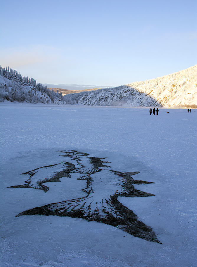 Drawing on the Yukon river for the (S)hiver winter festival 2019. 8 metres long. Charcoal mixed with water. Dawson City, Yukon.