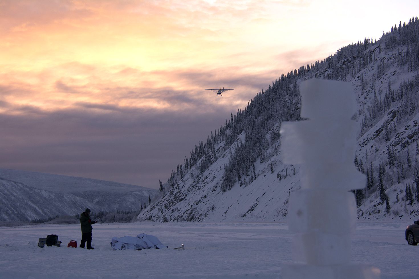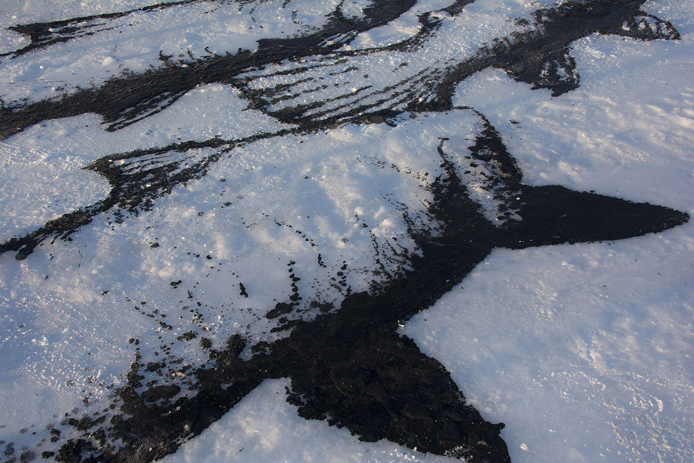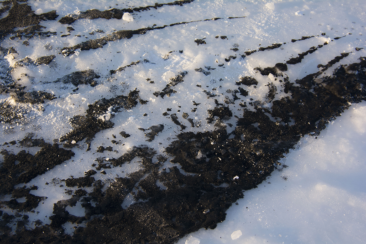Drawing on the Yukon river for the (S)hiver winter festival 2019. 8 metres long. Charcoal mixed with water. Dawson City, Yukon.